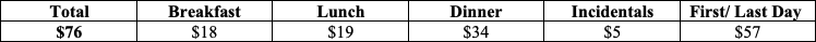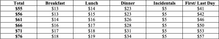 The table below offers a detailed breakdown of “Meals & Incidental Expenses”, which are composed of amounts for breakfast, lunch, dinner and incidentals. The first/last day amounts are reduced allowances of 75%.