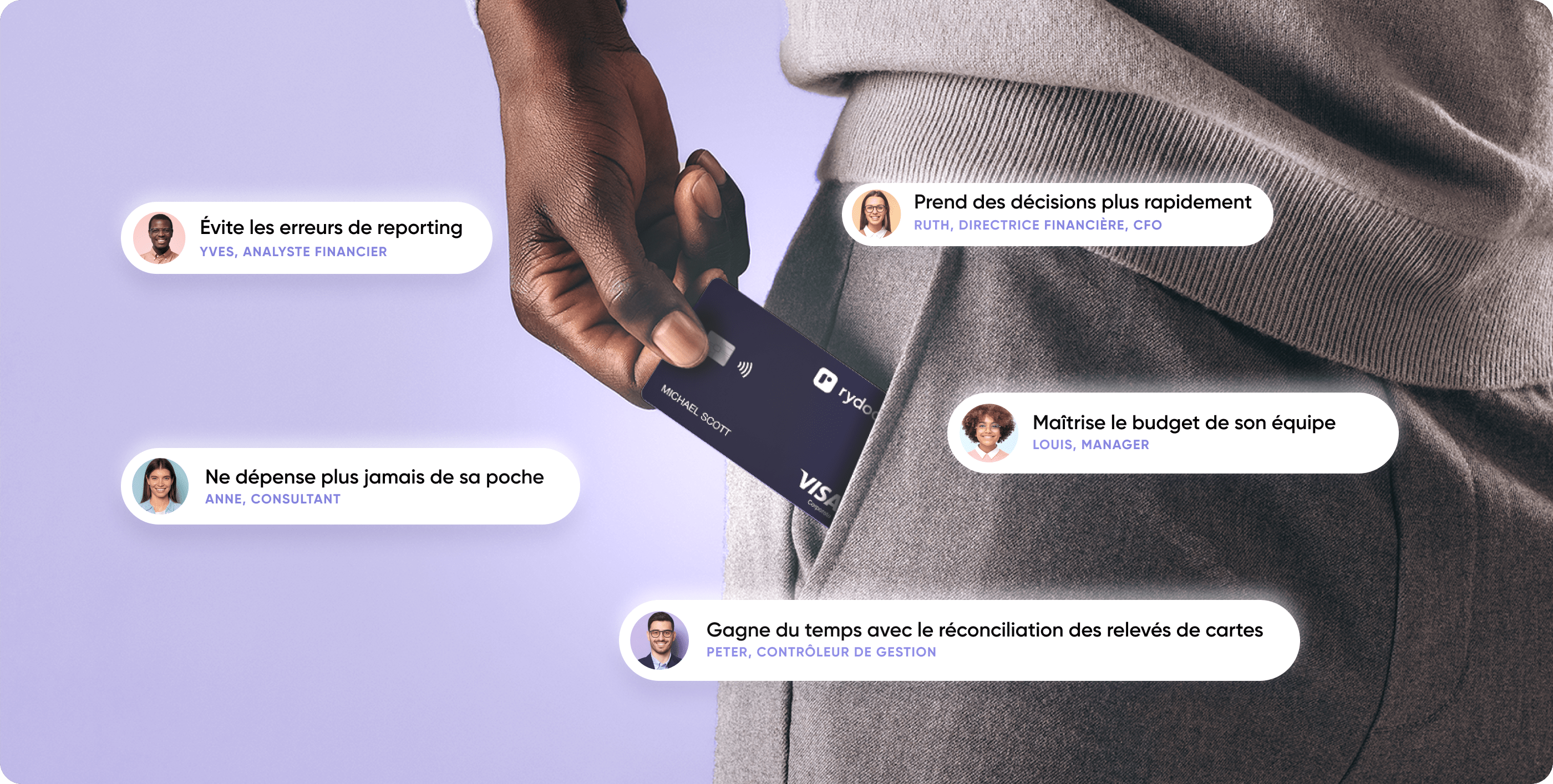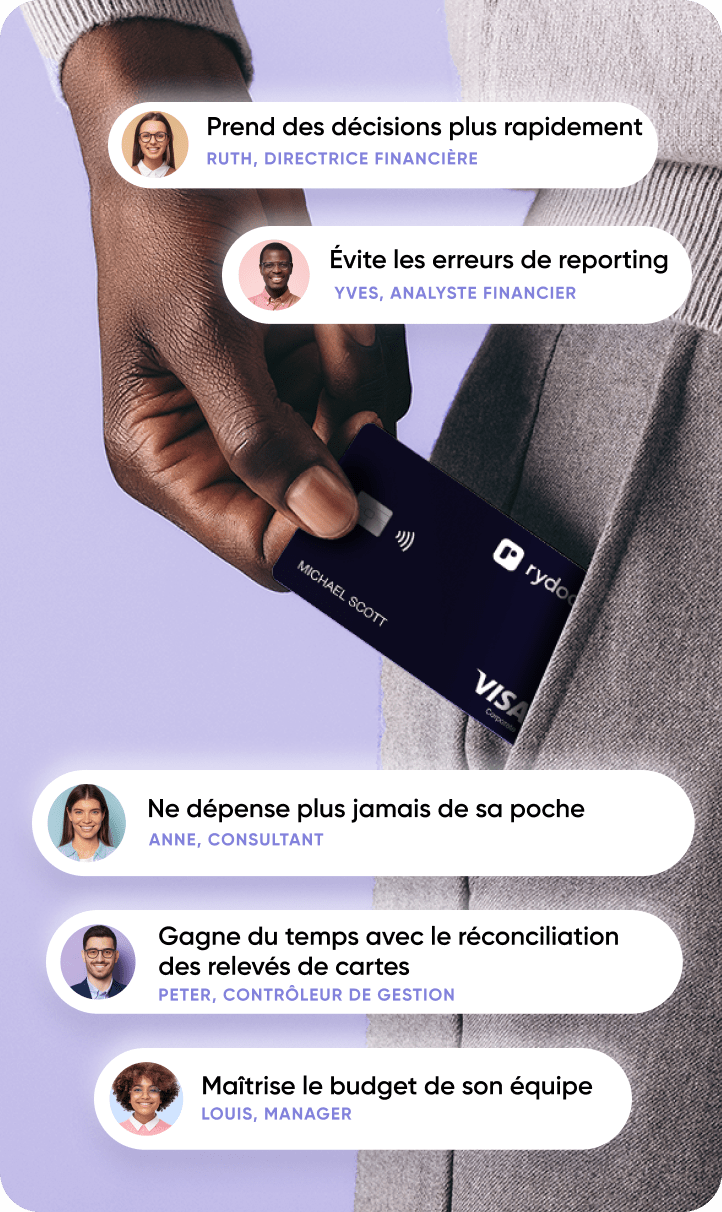 Des cartes de paiement intelligentes, virtuelles ou physiques, pour les dépenses professionnelles ponctuelles et/ou courantes. Le tout intégré à Rydoo, la plateforme de gestion des frais professionnels préférée du marché.