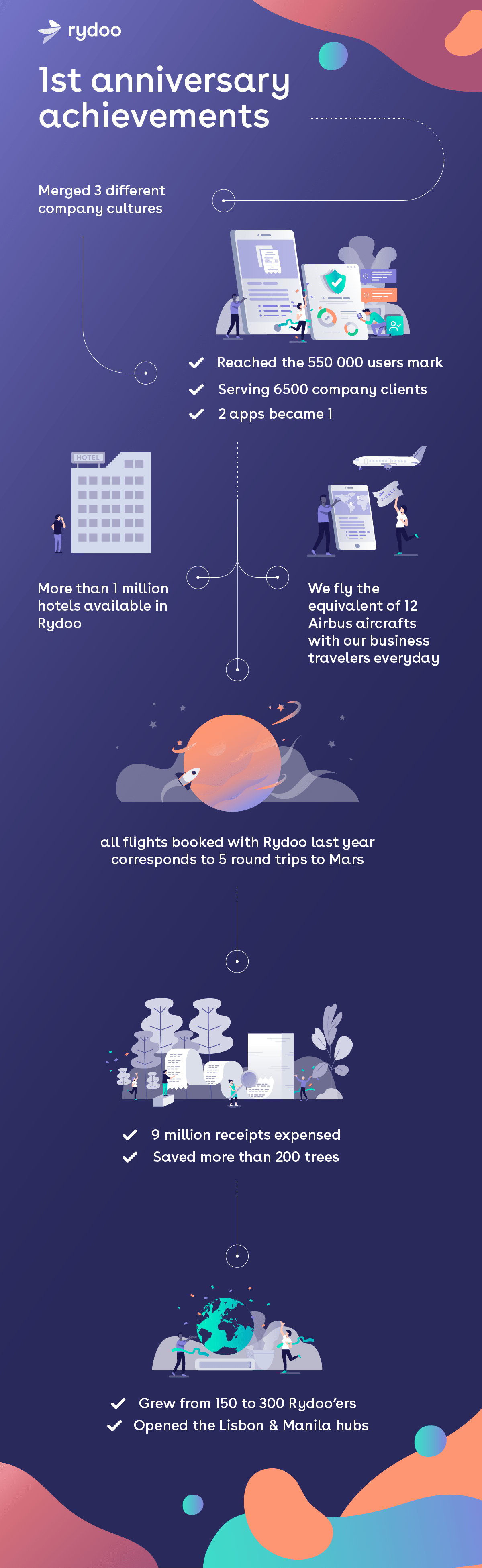 On June 5th, 2018, after a year of hard work, Xpenditure and iAlbatros came together, and with the investment of Sodexo launched Rydoo together, the first end-to-end solution that truly reinvents Travel & Expense. Here’s where we stand today, one year later.