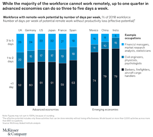 Naturally, not everyone can work remotely. It’s difficult to see how a barber could do their job online for example! But in advanced economies, where digital service-based work is more prevalent, then more people can take advantage of the move.