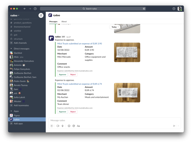 - Increase productivity: simply drop your receipts into your Slack channel wherever you are to let our smart bots upload them to your Rydoo account for you.